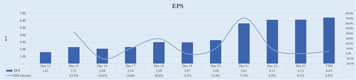 Apple's EPS has shown significant growth over the past decade. Starting from $1.61 in FY 2014, it increased to $6.13 in FY 2023. Over the TTM, Apple’s EPS further increased to $6.43. This represents a 5-year CAGR of 16.6% and a 10-year CAGR of 14.9%.