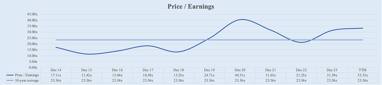 Similarly, Apple's Price/Earnings ratio has also increased significantly over the past decade. Starting from 17.11x in FY 2014, it increased to 32.53x over the TTM.