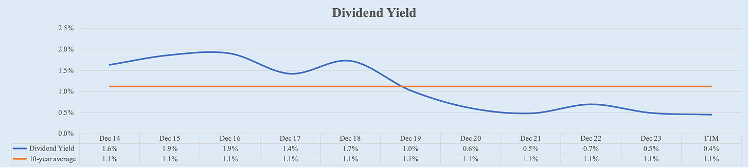Conversely, Apple's dividend yield has declined over the past decade due to the stock price appreciating faster than dividend increases. Starting from 1.6% in FY 2014, the dividend yield has decreased to 0.4% over the LTM. This decline reflects the substantial growth in Apple's stock price, which has outpaced the rate of dividend growth.