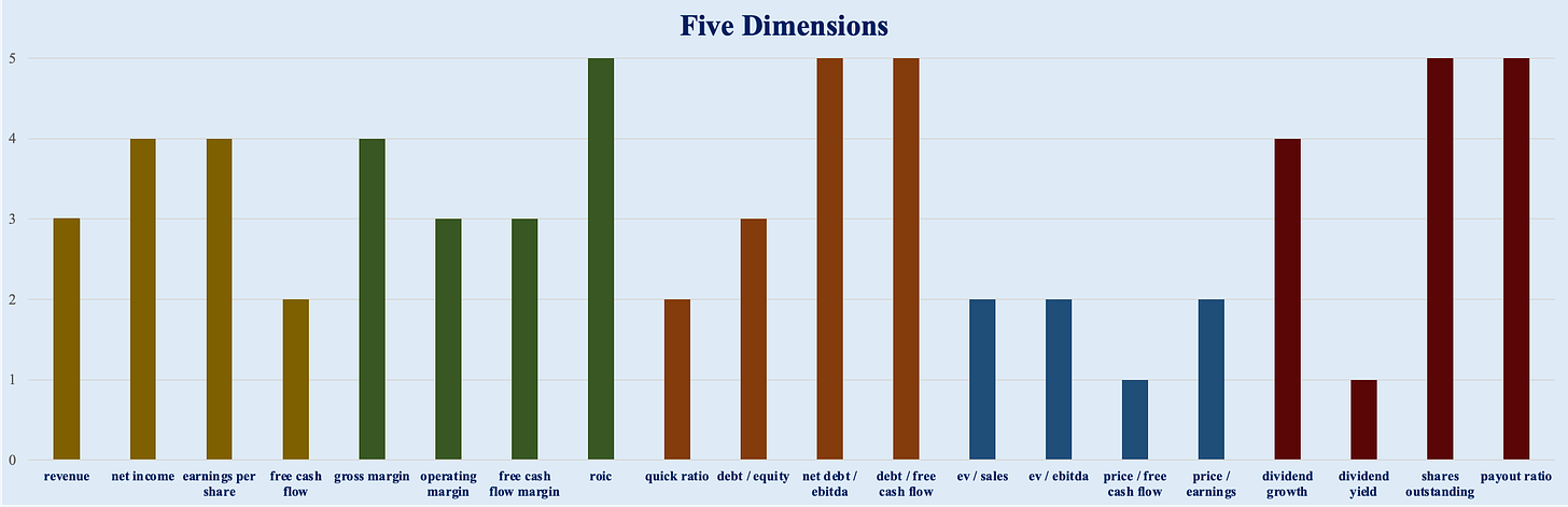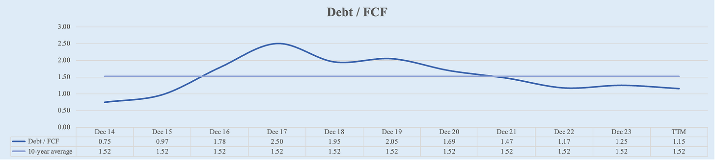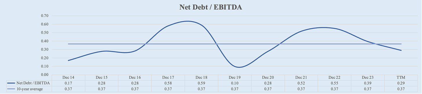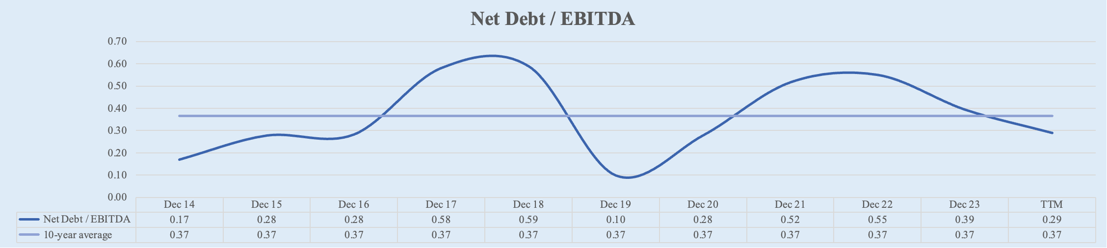 Net Debt / EBITDA, Debt / FCF (Rating: 5): Low leverage.
