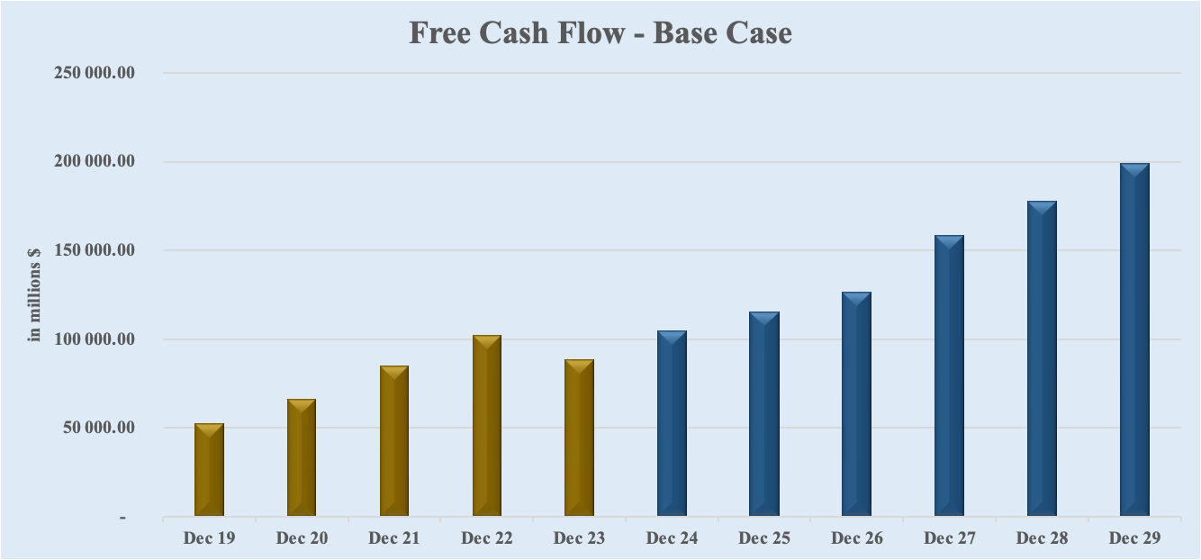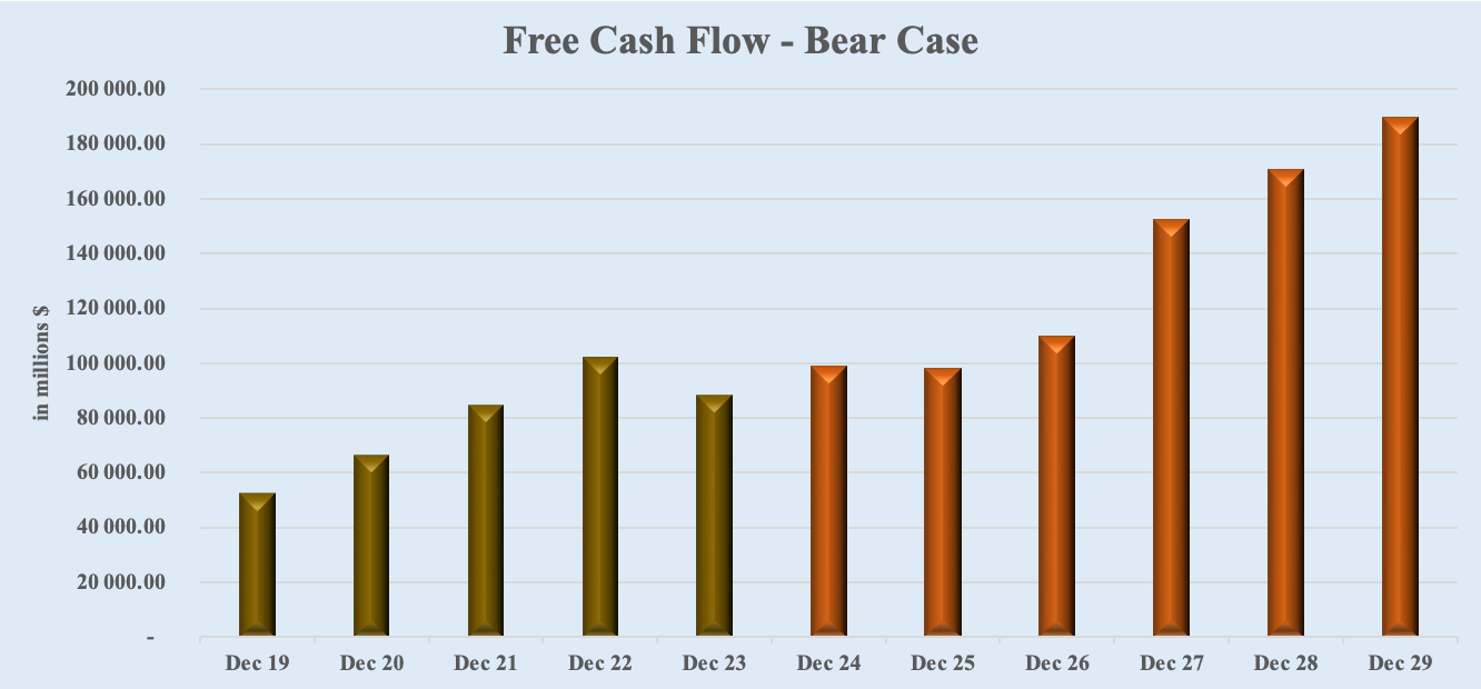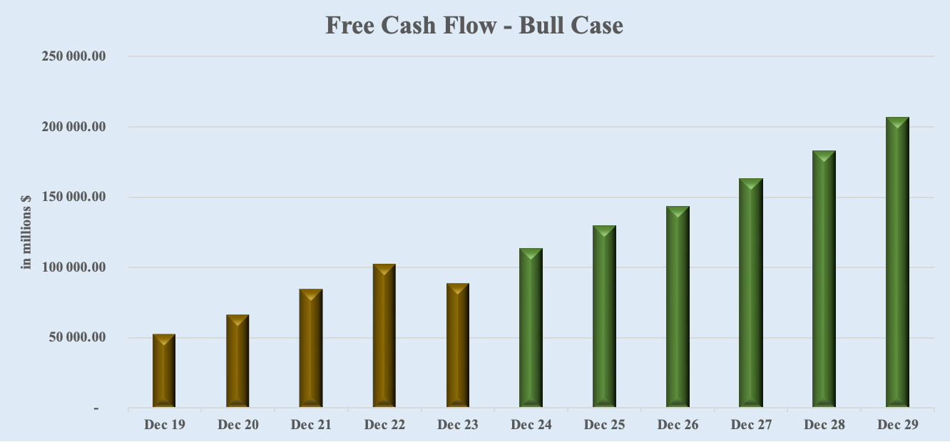 I employ Wall Street analysts' free cash flow projections to compute Apple’s fair value. The average estimates of the next 5 years are utilized for a Base Case scenario, the highest estimates for a Bull Case scenario, and the lowest estimates for a Bear Case scenario.