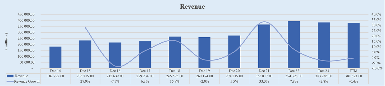 Apple's revenue has shown moderate growth over the past decade. Starting from $182.8 billion in FY 2014, it increased to $383.3 billion in FY 2023. Over the TTM, Apple’s revenue slightly decreased to $381.6 billion. This represents a 5-year CAGR of 7.5% and a 10-year CAGR of 7.6%.