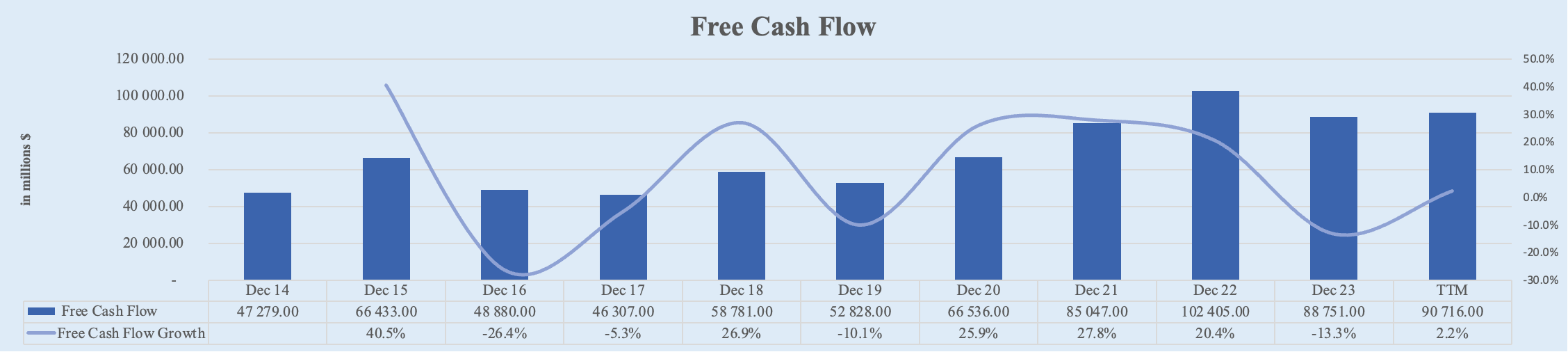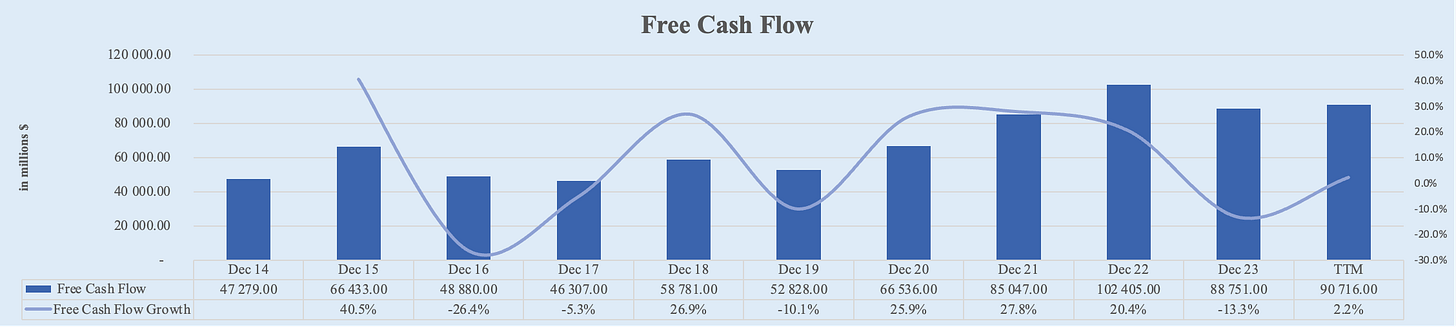 Apple's free cash flow has shown moderate growth over the past decade. Starting from $47.3 billion in FY 2014, it increased to $88.8 billion in FY 2023. Over the TTM, Apple’s free cash flow slightly increased to $90.7 billion. This represents a 5-year CAGR of 9.1% and a 10-year CAGR of 6.7%.