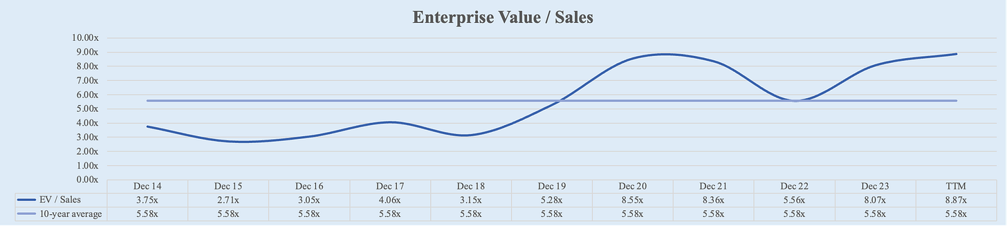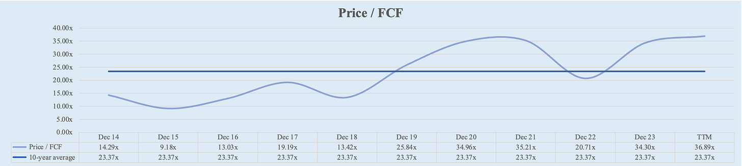 Similar to EV/Sales ratio, Apple's Price/FCF ratio has increased significantly over the past decade. Starting from 14.29x in FY 2014, it increased to 34.30x in FY 2023, more than double. Over the TTM, Apple’s Price/FCF ratio further increased to 36.0x.