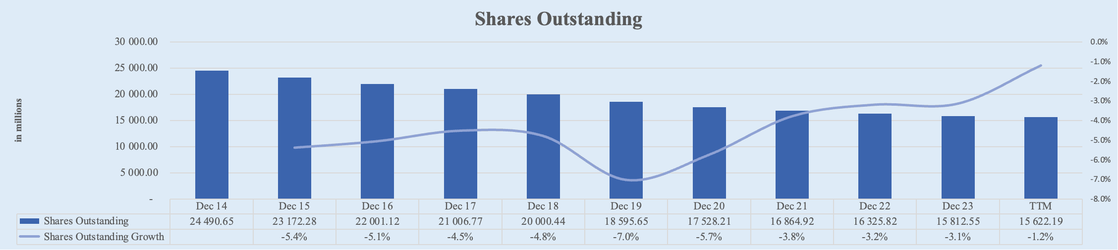 Shares Outstanding (Rating: 5): More than 1/3 reduction in share count.