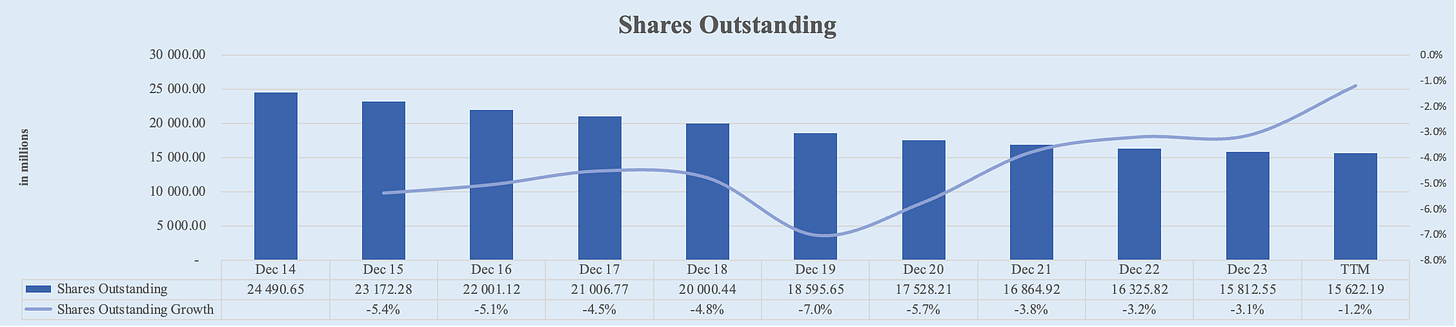 Now onto one of the most important metrics: Apple's shares outstanding have significantly decreased over the past decade. Starting from 24,490.65 million shares in FY 2014, the number of shares decreased to 15,812.55 million in FY 2023. Over the LTM, Apple’s shares outstanding further decreased to 15,622.19 million. This represents a 5-year CAGR of -3.8% and a 10-year CAGR of -4.0%. Just look at the magnitude of this: Apple bought back almost 10 billion shares over the last decade, reducing more than 1/3 of the shares outstanding. That’s remarkable!