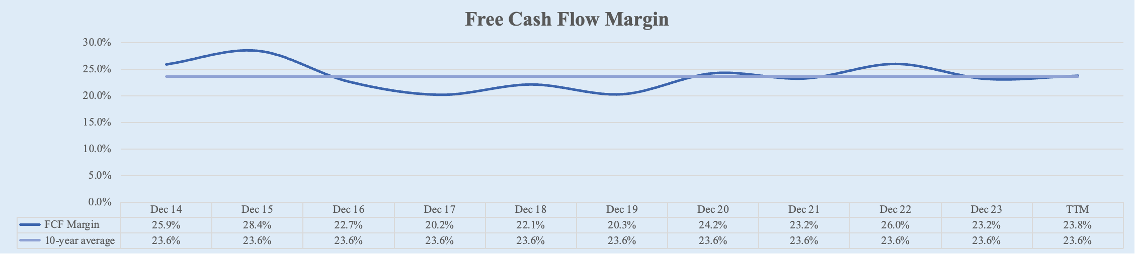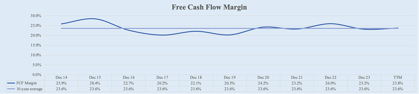 Apple's free cash flow margin has remained relatively stable within the 20%-25% range over the past decade. Starting at 25.9% in FY 2014, it saw a slight decline to 23.2% by FY 2023. Recently, over the trailing twelve months (TTM), Apple’s FCF margin has increased slightly to 23.8%. This trend reflects a 5-year average of 23.4% and a 10-year average of 23.6%.