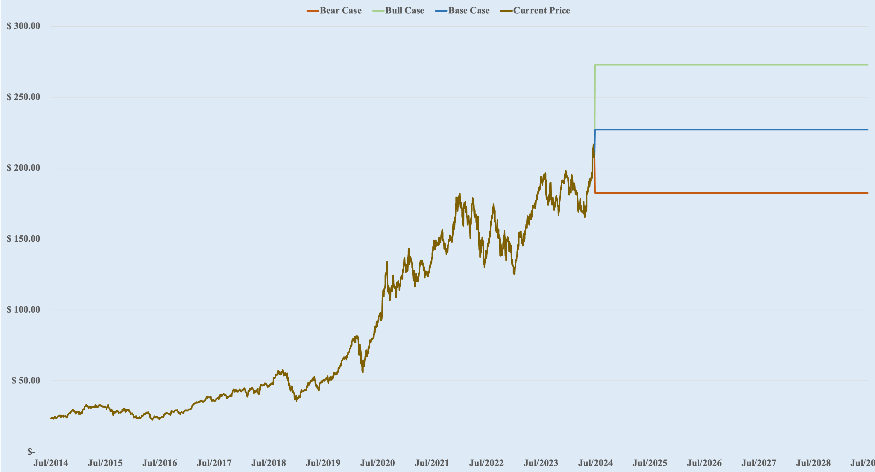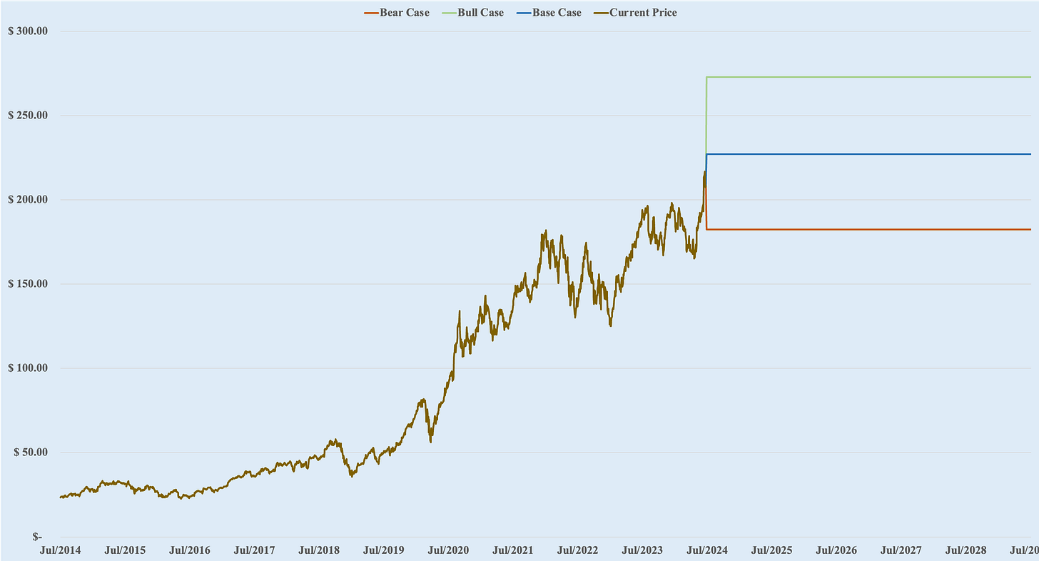 Base Case: $227, 8.6% above the current price, meaning Apple is slightly undervalued.