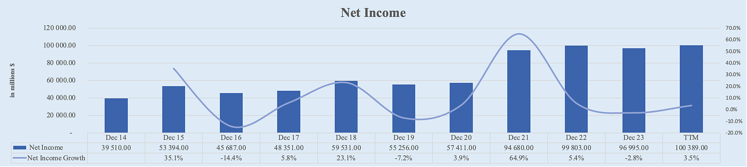 Apple's net income has shown strong growth over the past decade. Starting from $39.5 billion in FY 2014, it increased to $97.0 billion in FY 2023. Over the TTM, Apple’s net income increased to $100.4 billion. This represents a 5-year CAGR of 11.0% and a 10-year CAGR of 9.8%.